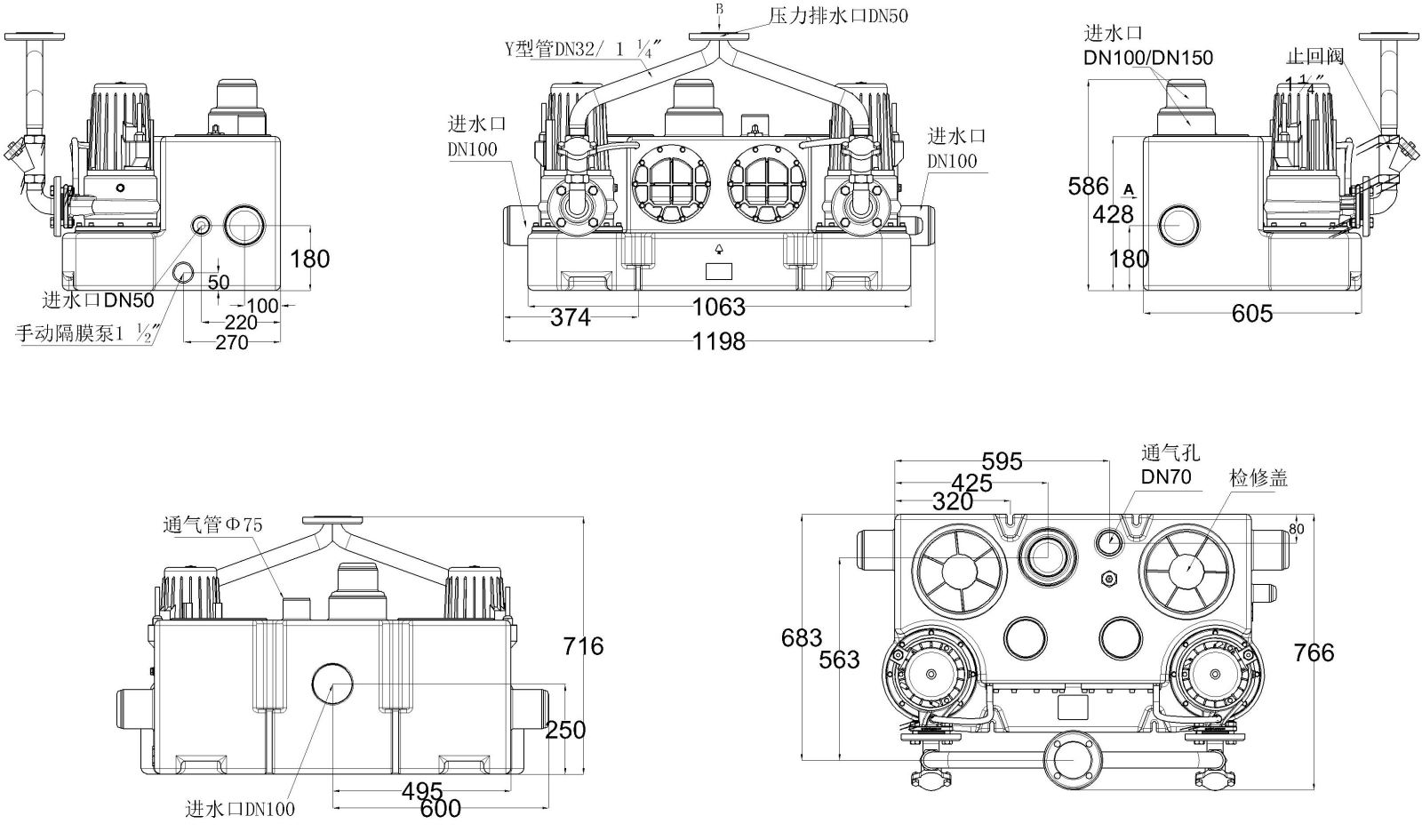PE塑料箱体,内装单向阀,Y型管,压力排水管DN50法兰片和柔性连接,带管箍的通气管连接、平稳的气动液位控制,紧凑的双泵提升机