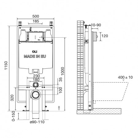 预先安装结构,砌筑墙前面安装,石膏板墙壁和轻墙技术支撑轨,减少厚度(90mm);配备AZOR PLUS进水阀,延迟注水(每天节水可达9升),静音阀1级NF认证